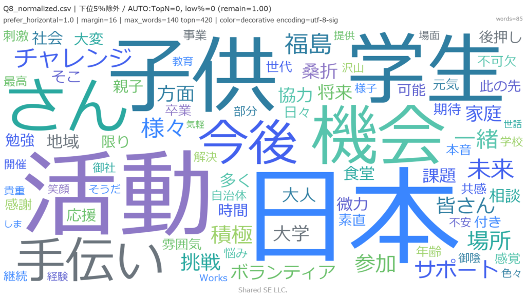 ネットワーク図では結ばれませんでしたが、重要語抽出においては「日本」という言葉が最高値を記録しました。 これは、「日本の未来にとって必要な事業である」という、地域活動の枠を超えた最大級の賛辞が含まれていることを示唆しています。彼らはCARNIVAL WORKSの活動の中に、地域課題の解決だけでなく、日本の社会構造そのものにポジティブな影響を与える可能性を感じ取っています。